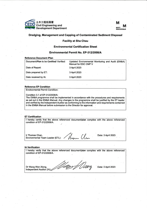 In April 2021, Mott MacDonald Hong Kong Limited (MMHK) was appointed by CEDD to provide Environmental Team (ET) services and prepare updated version of the Manual under “Agreement No. CE 59/2020 (EP) Environmental Monitoring and Audit for Disposal Facility to the East of Sha Chau (2021-2026) – Investigation”, so as to cater the latest operation of Contaminated Mud Pit V (CMP V).