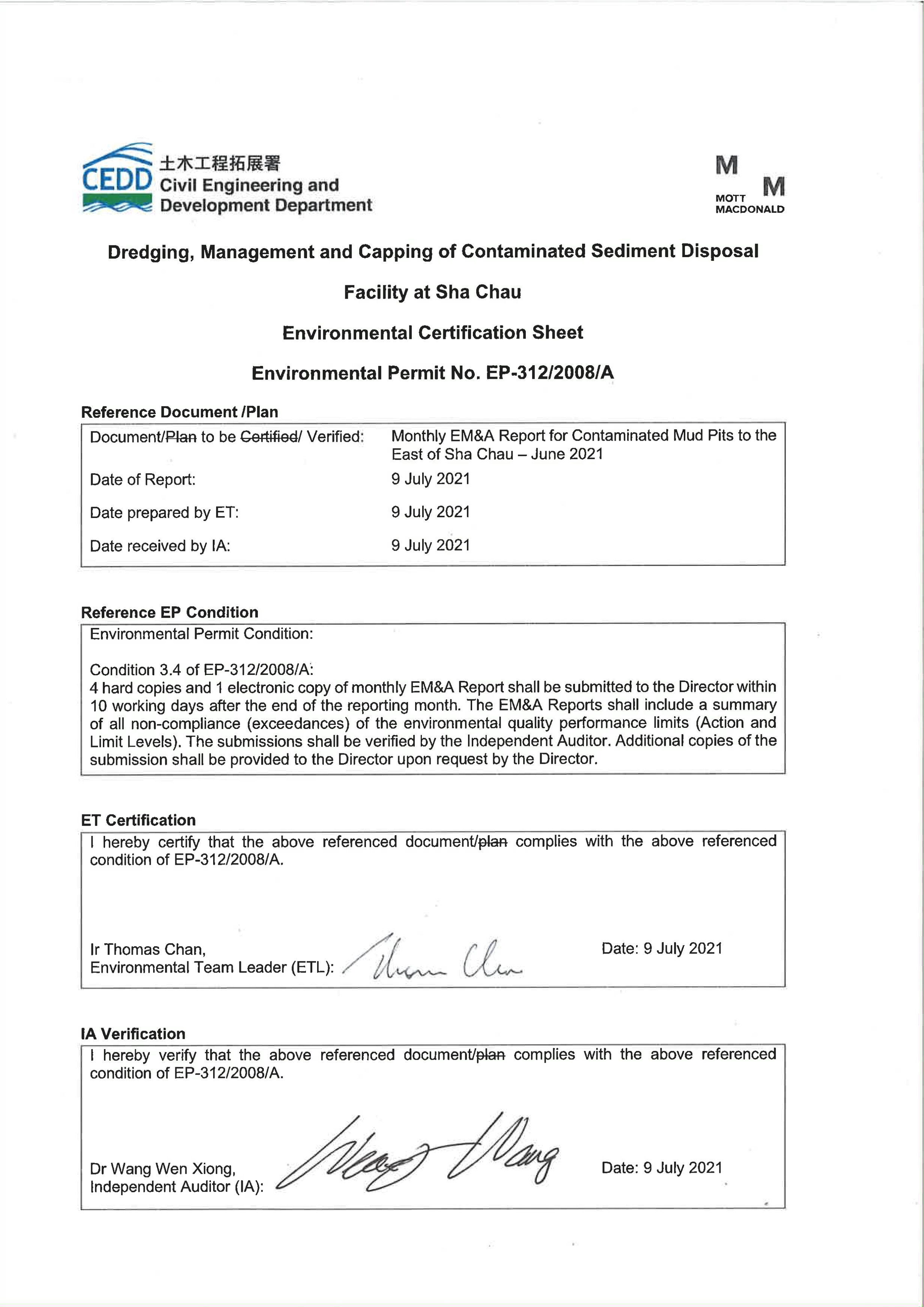 Monthly EM&A Report for Contaminated Mud Pits to the East of Sha Chau – June 2021 |
