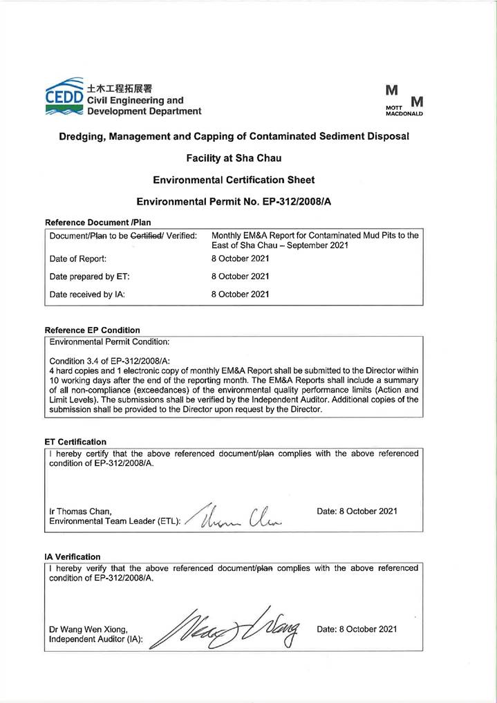 Environmental Permits (EPs) (Ref. No. EP-312/2008/A) was issued by the Environmental Protection Department (EPD) to the CEDD, the Permit Holder, on 28 November 2008 for the Project - Disposal of Contaminated Sediment – Dredging, Management and Capping of Sediment Disposal Facility at Sha Chau.