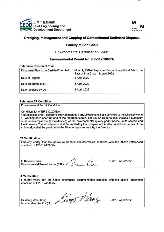 Environmental Permits (EPs) (Ref. No. EP-312/2008/A) was issued by the Environmental Protection Department (EPD) to the CEDD, the Permit Holder, on 28 November 2008 for the Project - Disposal of Contaminated Sediment – Dredging, Management and Capping of Sediment Disposal Facility at Sha Chau.