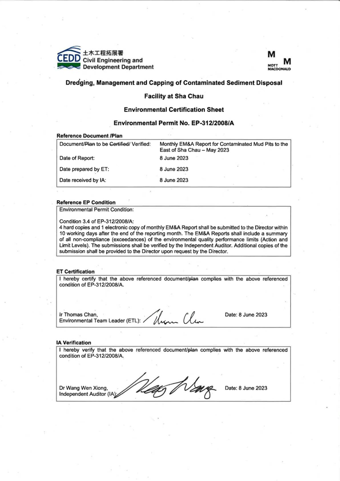 Environmental Permits (EPs) (Ref. No. EP-312/2008/A) was issued by the Environmental Protection Department (EPD) to the CEDD, the Permit Holder, on 28 November 2008 for the Project - Disposal of Contaminated Sediment – Dredging, Management and Capping of Sediment Disposal Facility at Sha Chau.