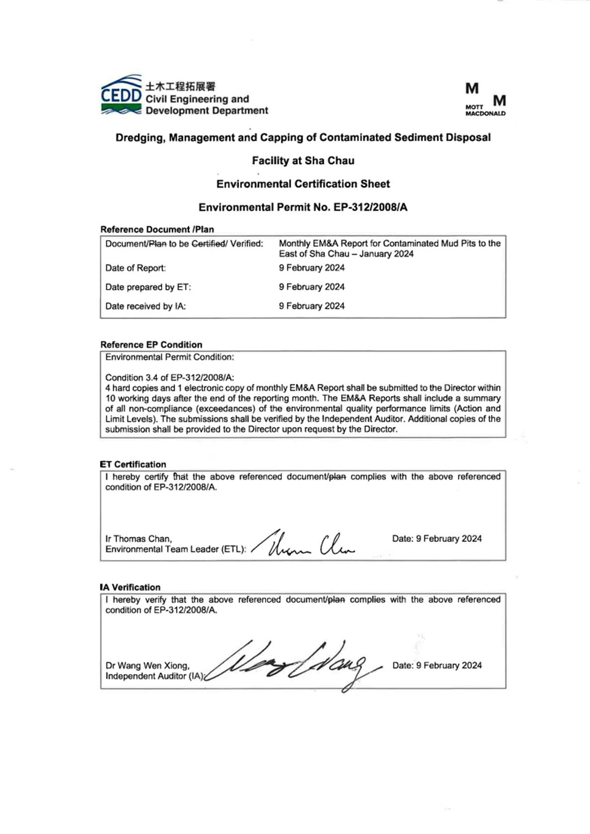 Environmental Permits (EPs) (Ref. No. EP-312/2008/A) was issued by the Environmental Protection Department (EPD) to the CEDD, the Permit Holder, on 28 November 2008 for the Project - Disposal of Contaminated Sediment Dredging, Management and Capping of Sediment Disposal Facility at Sha Chau.