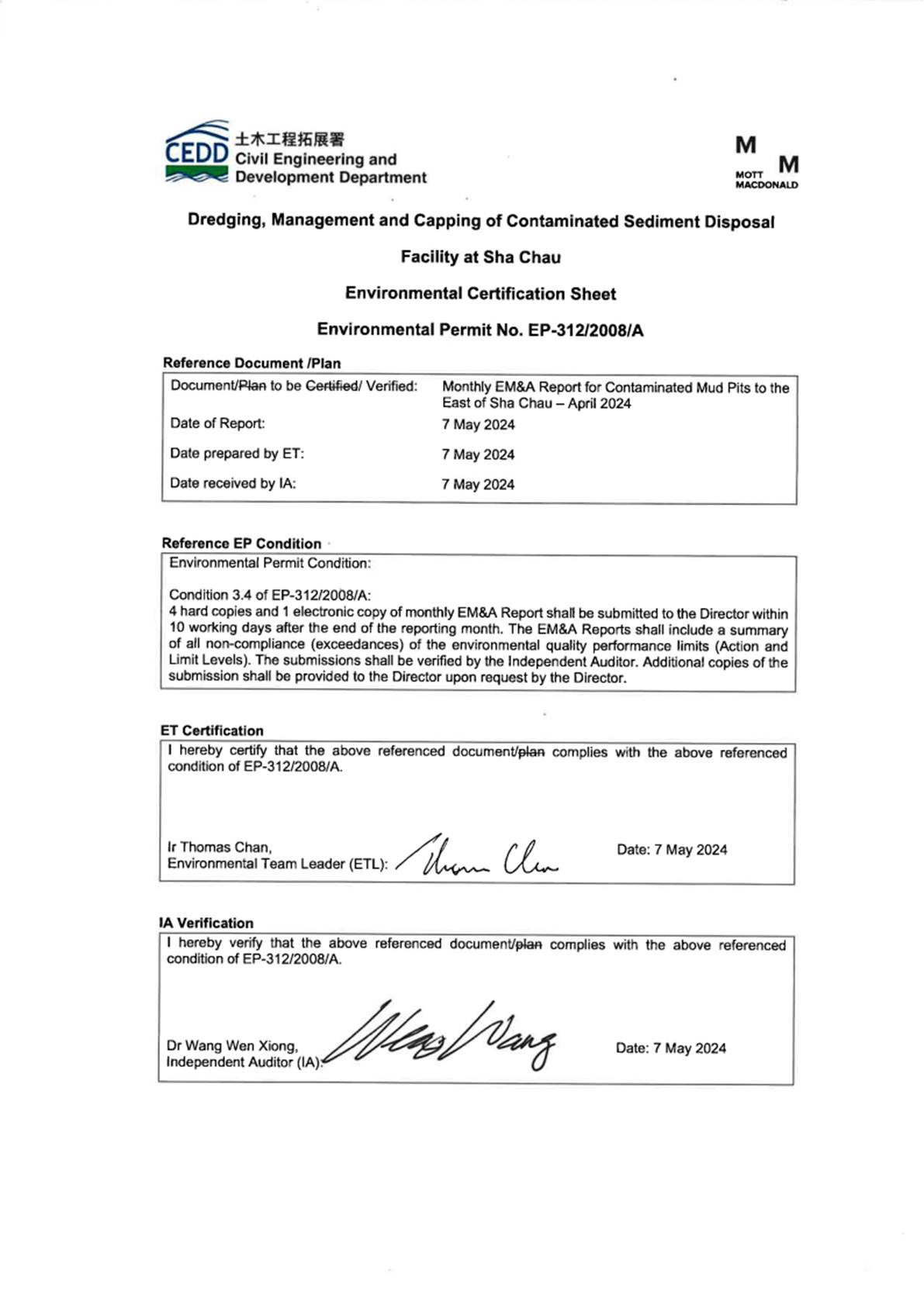 Environmental Permits (EPs) (Ref. No. EP-312/2008/A) was issued by the Environmental Protection Department (EPD) to the CEDD, the Permit Holder, on 28 November 2008 for the Project - Disposal of Contaminated Sediment – Dredging, Management and Capping of Sediment Disposal Facility at Sha Chau.