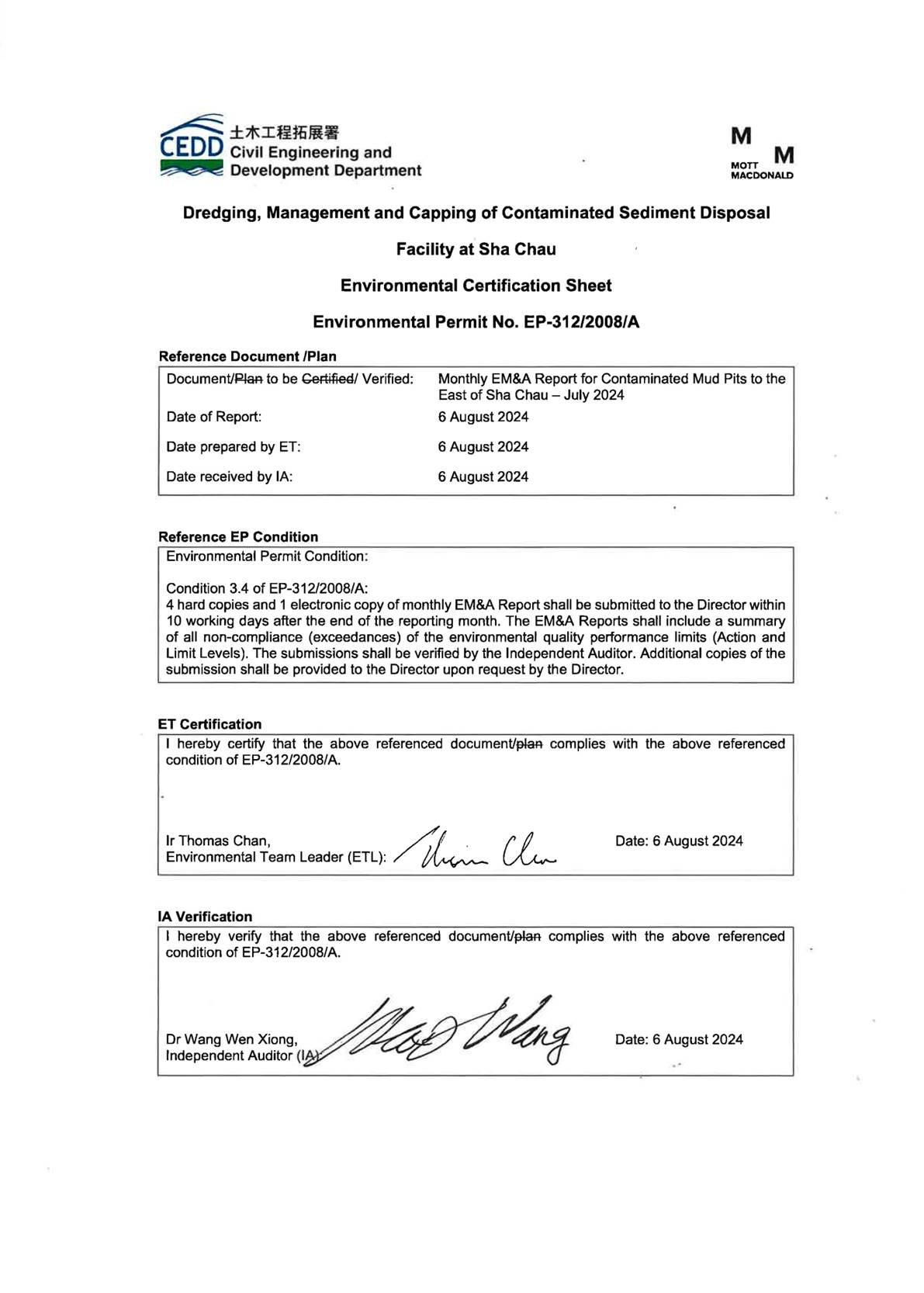 Environmental Permits (EPs) (Ref. No. EP-312/2008/A) was issued by the Environmental Protection Department (EPD) to the CEDD, the Permit Holder, on 28 November 2008 for the Project - Disposal of Contaminated Sediment – Dredging, Management and Capping of Sediment Disposal Facility at Sha Chau.