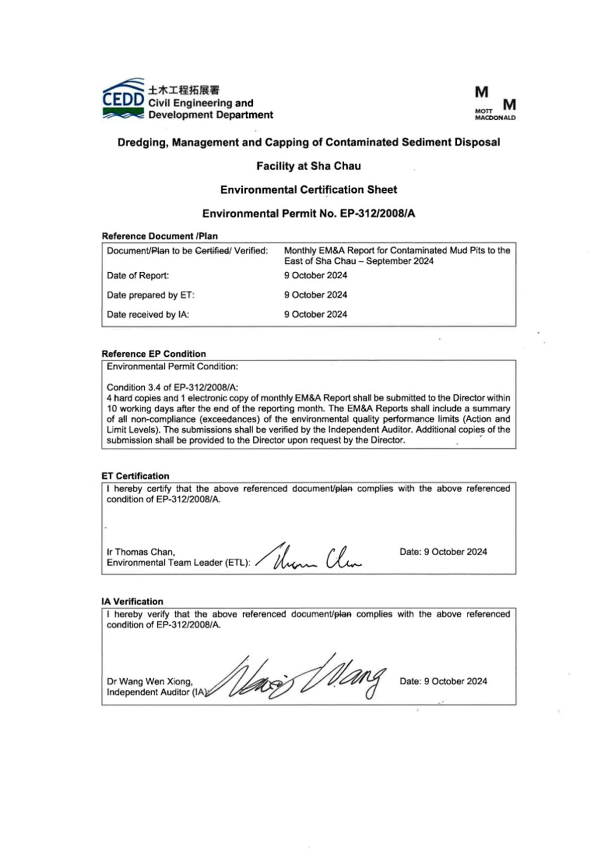 Monthly EM&A Report for Contaminated Mud Pits to the East of Sha Chau – September 2024 |