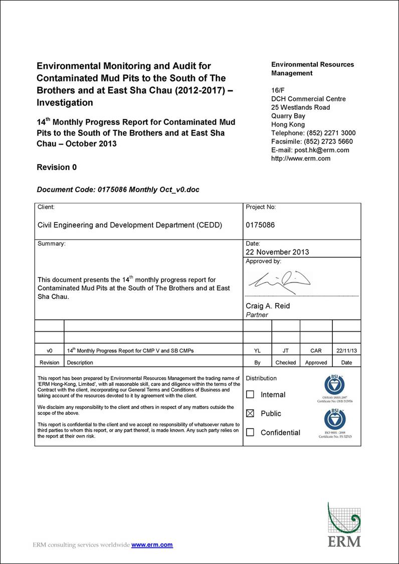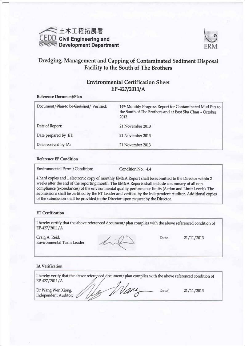 Specific Sediment Chemistry Monitoring conducted in August 2013 is presented in this 14th Monthly Report. Detailed discussion will be presented in the
