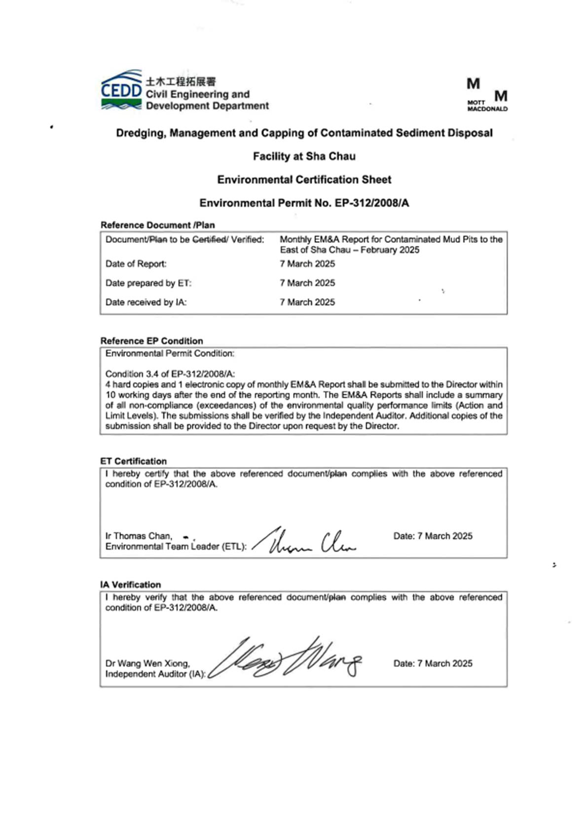 Environmental Permits (EPs) (Ref. No. EP-312/2008/A) was issued by the Environmental Protection Department (EPD) to the CEDD, the Permit Holder, on 28 November 2008 for the Project - Disposal of Contaminated Sediment – Dredging, Management and Capping of Sediment Disposal Facility at Sha Chau.