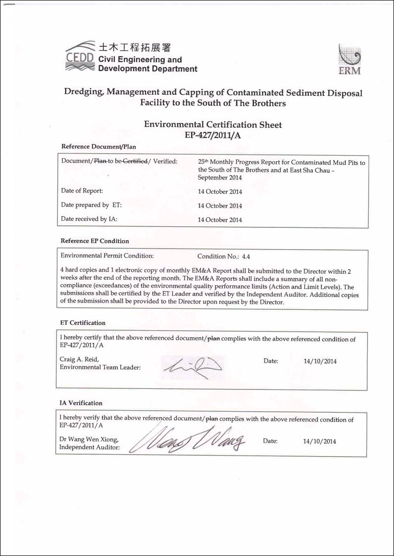 Specific Sediment Chemistry for CMP 1 was undertaken on 18 September 2014; and