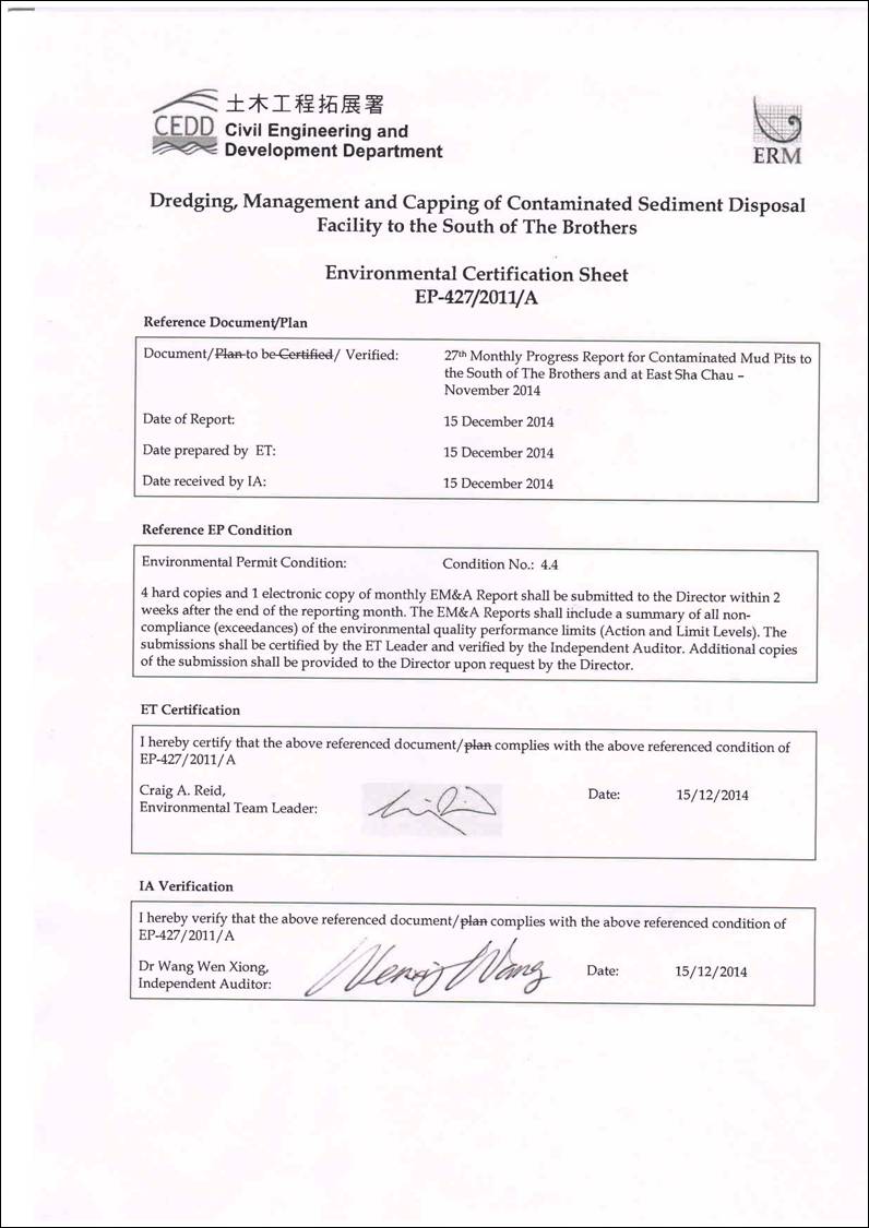 This 27th Monthly Progress Report covers the EM&A activities for the reporting month of November 2014.