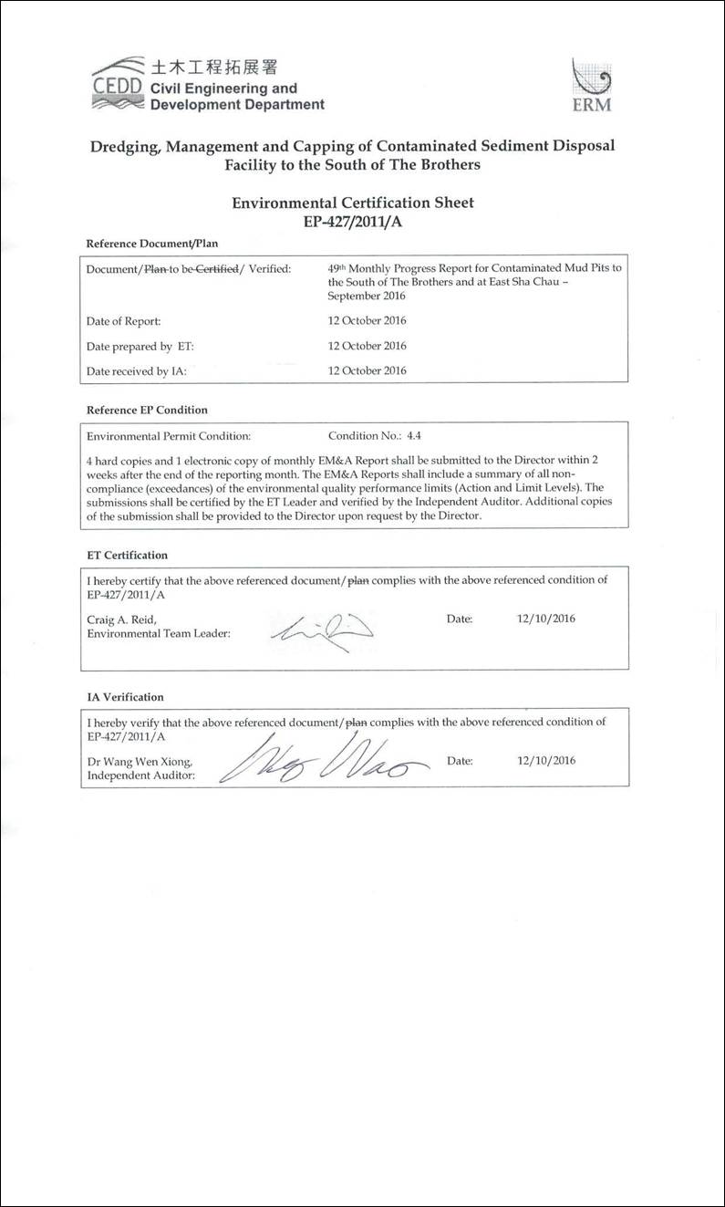 This 49th Monthly Progress Report covers the EM&A activities for the reporting month of September 2016.