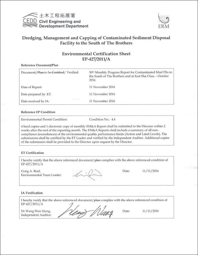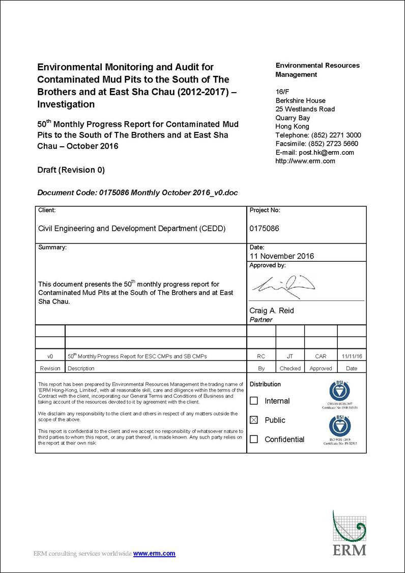 Overall, in-situ measurement results of the Routine Water Quality Monitoring indicated that the disposal operation at ESC CMP Vd did not appear to cause any unacceptable impacts in water quality in October 2016.