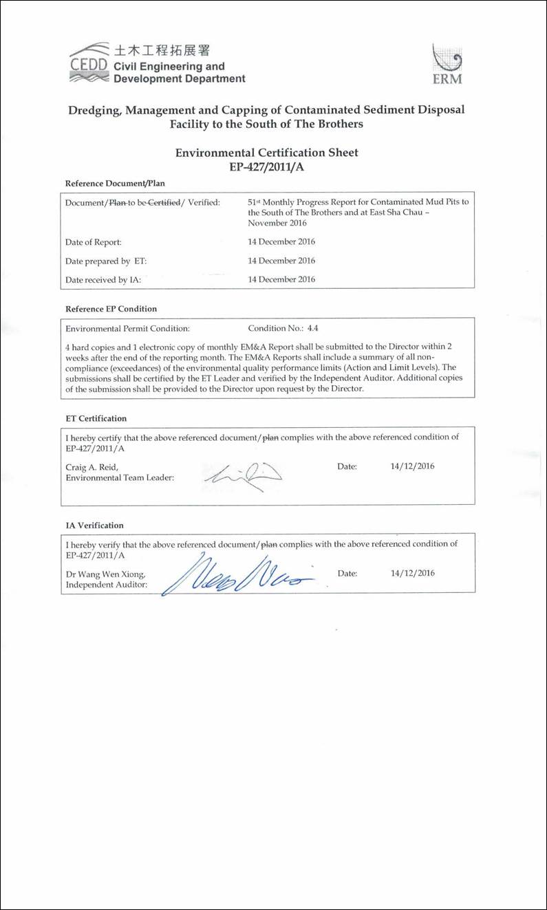 Routine Water Quality Monitoring of ESC CMPs in November 2016; and