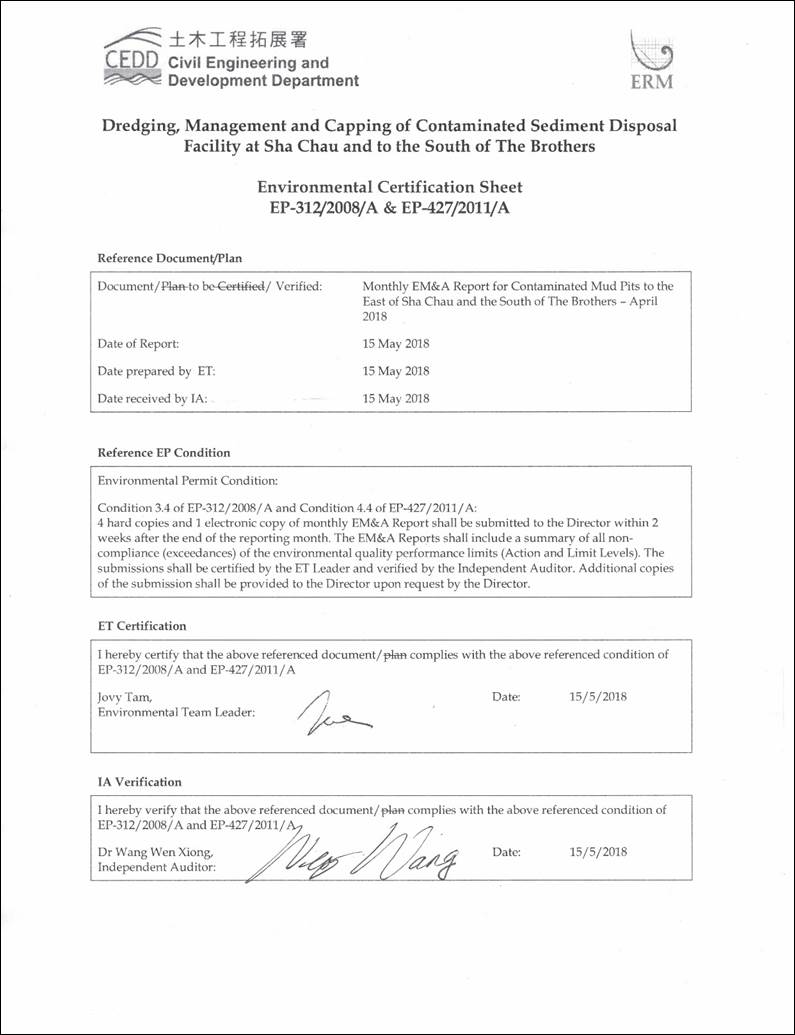 the following activities for ESC CMP V is presented in this Monthly EM&A Report for April 2018: